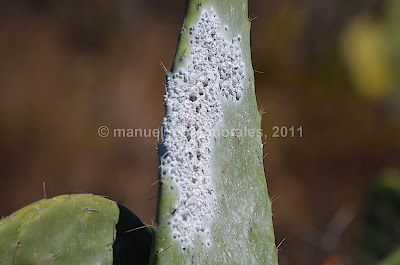 La cochinilla (Dactylapius Coccus Costa) es un pequeño animalito parásito de las pencas de nopal o tunera mexicana, que son las que producen los higos tunos, higos chumbos o higos picos. El aspecto de la cochinilla se puede ver en la foto superior: parecen pequeñas bolsas llenas de tinta roja y cubiertas de un polvillo blanco.